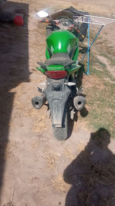 Спортивный мотоцикл в зеленом обвесе с наклейками (включая «46», «Kaspersky», «UDAT/UCAT», «Future»). Полный пластиковый обтекатель, двухместное сиденье, клипоны, ветровое стекло тонированное. Передняя оптика с раздельными фарами, зеркала на обтекателе с повторителями. Дисковые тормоза спереди и сзади, передний тормозной диск увеличенного диаметра с перфорацией. Литые диски с красной окантовкой, дорожные шины. Два выхлопа, выведенных по бокам под хвостом. Задний светодиодный фонарь, поворотники на кронштейнах, номерной держатель. Центральная подножка и боковая, цепной привод. На левом борту видны декоративные/тюнинговые элементы и слайдеры. Подойдет для городских поездок и любителей спортивного стиля.