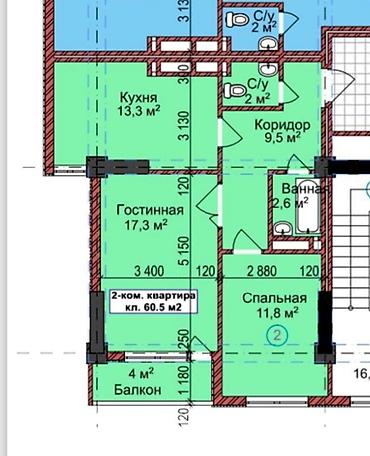 2 комнаты, 60 м², Элитка, 7 этаж, Готовая ПСО (под самоотделку)