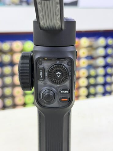 - Управляющая панель на рукоятке: джойстик для панорамы/тилта, колесо управления, кнопка MODE, кнопка записи/старт‑стоп, меню.