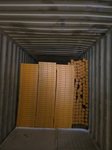 Предлагаются для продажи желтые металлические формы для опалубки, сложенные в штабель. Также в контейнере находится кабина грузового автомобиля, укрытая защитным материалом.