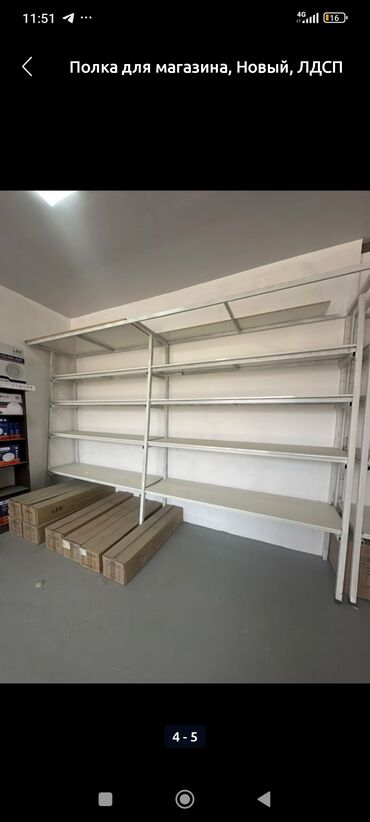 - Конструкция: модульная, металлический каркас с верхней связью и вертикальными стойками; полки из ЛДСП.