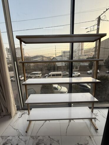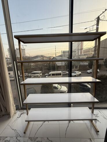 - Конструкция: металлический каркас с покрытием под латунь/золото, горизонтальные полки белого цвета