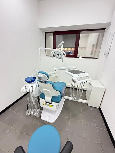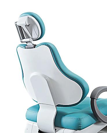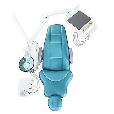 Стоматологическое кресло с интегрированным освещением и панелью управления, выполненное в бирюзовом цвете. Конструкция включает в себя регулируемое кресло пациента, светильник на шарнирном кронштейне для оптимального освещения рабочей зоны и блок управления инструментами. Эргономичный дизайн кресла обеспечивает комфорт для пациента во время процедур. Оборудование предназначено для использования в стоматологических кабинетах и клиниках, обеспечивая функциональность и удобство для врача и ассистента.