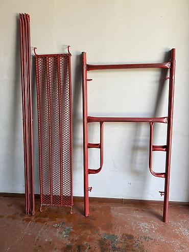 Набор строительных лесов различных типов, включая рамные и трубчатые элементы. Эти компоненты предназначены для возведения временных конструкций, обеспечивающих доступ к рабочей зоне на высоте. В к...