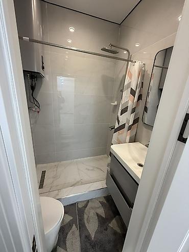 - Санузел с душевой зоной в керамограните, верхний душ, раковина с тумбой, зеркало, бойлер.