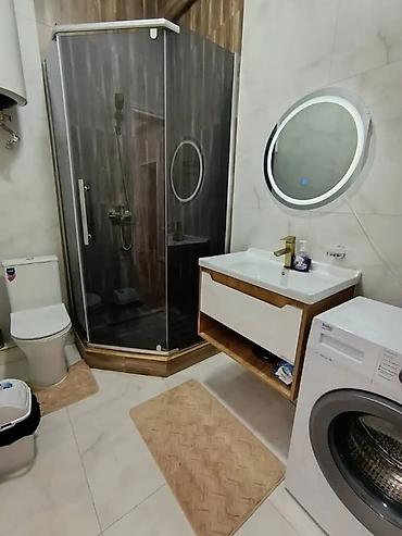 - Санузел: душевой уголок с стеклянными створками, инсталляция унитаза, умывальник с тумбой, круглое зеркало с подсветкой, водонагреватель, стиральная машина.