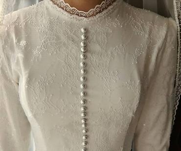 - Застежка/декор: ряд крупных жемчужных пуговиц по центру лифа и на манжетах.