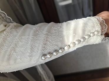 - Рукава: длинные, полуприталенные, с кружевными манжетами и жемчужным декором.