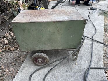 Сварочный трансформатор (стационарный), металлический корпус в зелёной окраске на подставке.