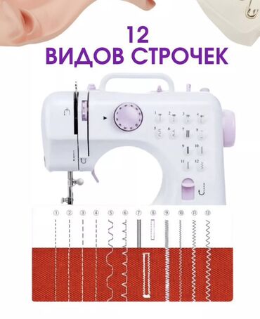- 12 видов строчек: прямые, зигзаги разной ширины, декоративные, штопка/стежка, выметывание петли.