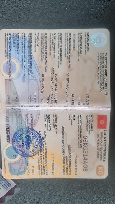 - Документы: свидетельство о регистрации Кыргызской Республики на Volvo FH, дизель, категория С; госномер на фото 06 KG 314 AOB