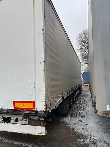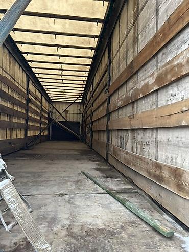 - Габариты прицепа: полноразмерный евростандарт (прибл. 13,6 м длина, 2,45 м ширина, 2,6–2,7 м внутренняя высота – визуально типовая величина для шторных полуприцепов).