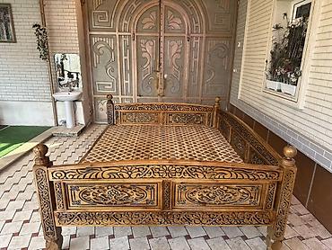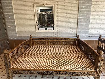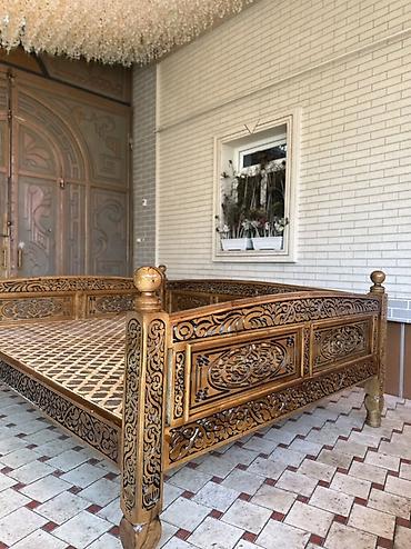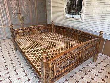 Резной деревянный тахта-лежак (айван/тапчан) для улицы и интерьера. - Материал: массив дерева. - Ручная резьба по всему периметру, декоративные панели с восточным орнаментом. - Высокие точёные сто...