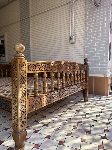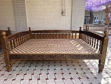 Резной деревянный тахта-лежак (айван/тапчан) для улицы и интерьера. - Материал: массив дерева. - Ручная резьба по всему периметру, декоративные панели с восточным орнаментом. - Высокие точёные сто...