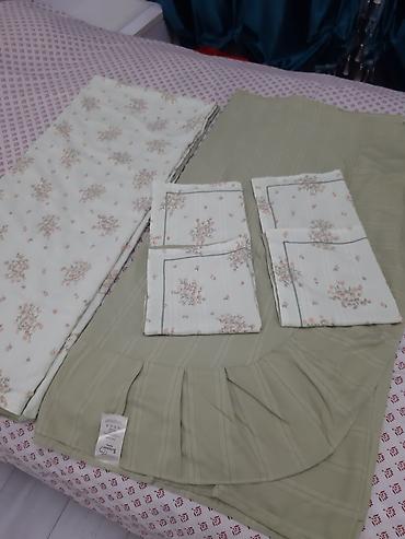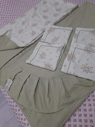 - Нежно‑оливковый подзор/юбка для кровати с мягкими складками
