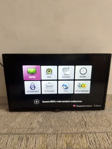 Меню на русском языке: экран, звук, каналы, время, сеть, мультимедиа, общие настройки. Поддержка работы в сети (иконка «Сеть»), раздел «Мультимедиа» для воспроизведения фильмов, музыки и фото. Есть цифровой тюнер для настройки каналов, часы/таймер, регулировка изображения и звука. На корпусе — стандартные кнопки управления и индикатор, питание от сетевого кабеля (в комплекте).