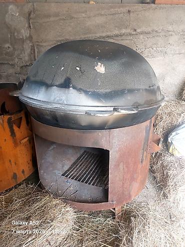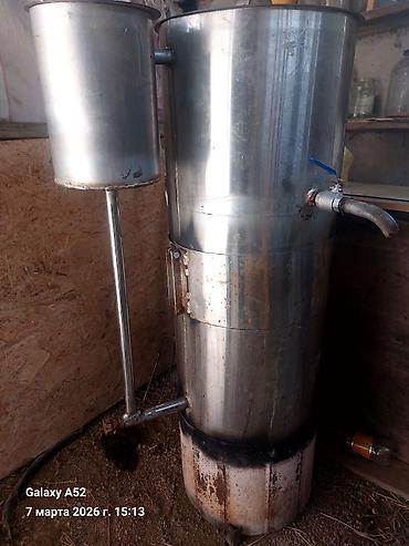 Самодельная дровяная печь-водонагреватель (буржуйка с баком). Описание: - Корпус печи из толстой стальной бочки с топочной камерой спереди и зольным отсеком снизу. - Топка рассчитана на дрова/угол...