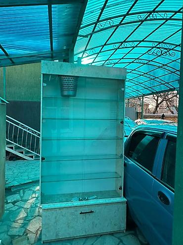 Состав комплекта на фото: стеклянная витрина со стеклянными полками и нижней тумбой + отдельный прилавок в идентичной отделке.
