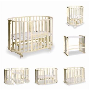 - Многофункциональная система 7-в-1: колыбель/круглая люлька, овальная кроватка, манеж, диванчик, приставная кровать к родительской, столик/пеленальный стол, детский столик с двумя стульями (по конфигурациям на последнем фото).