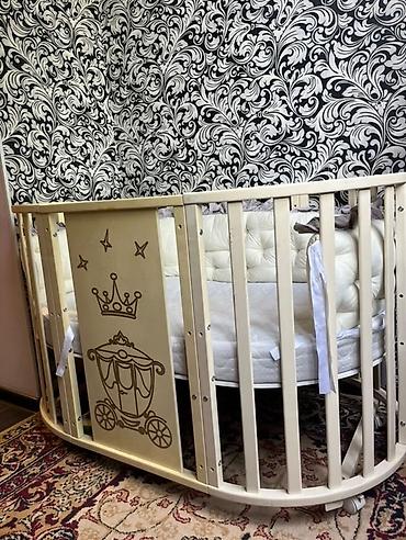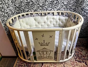 Трансформируемая детская кровать-манеж овальной формы с рисунком кареты и короны на торцевой панели.