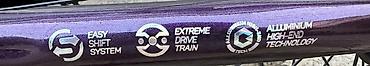 - Рама и вилка: аэродинамический алюминий (маркировка Alluminium High-End Technology), фиолетовый перламутровый окрас с голографическими логотипами JIXF.