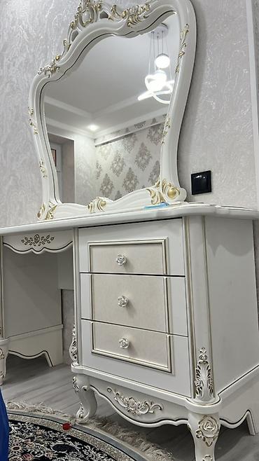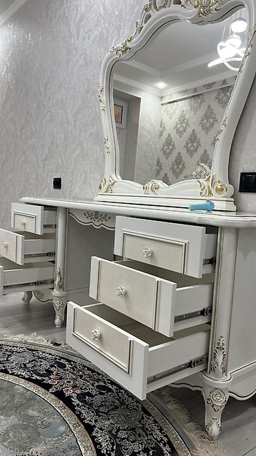 Идеально для спальни или будуара: много места для косметики, аксессуаров и украшений, а крупное зеркало визуально расширяет пространство и обеспечивает комфортный уход за собой. Классический дизайн с изящной лепниной и золотым патинированием подчёркивает интерьер в стиле неоклассика/барокко.