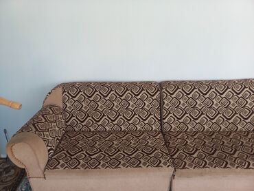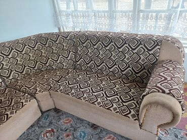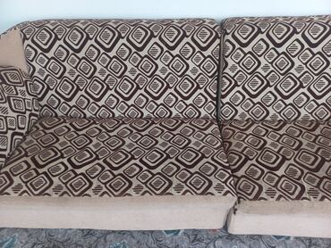 - Обивка: ткань с геометрическим узором (бежево‑коричневые ромбы), нижняя часть и подлокотники — однотонная бежево‑песочная ткань.