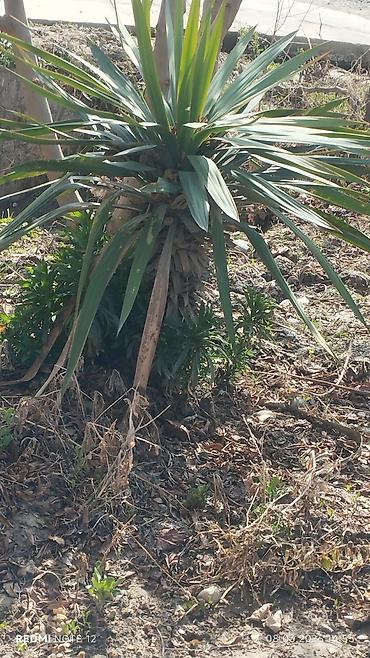 Юкка садовая (вероятно Yucca filamentosa/yucca gloriosa) – вечнозелёное декоративное растение с розеткой жёстких, мечевидных листьев. Формирует плотный куст с коротким стволиком, даёт прикорневые детки.