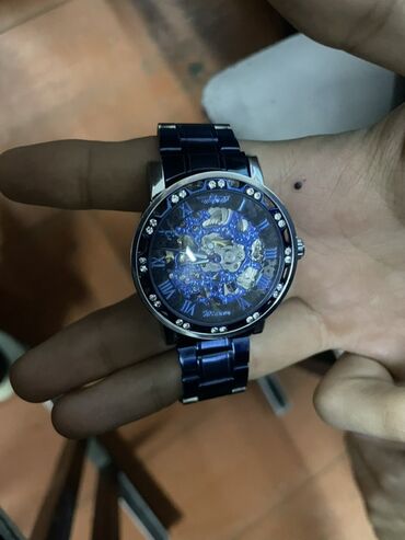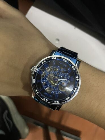 Механические наручные часы с открытым скелетоном и синим оформлением.х