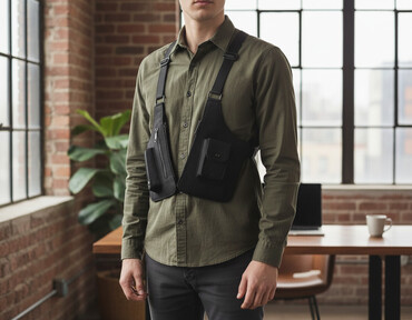 - Конструкция из двух симметричных модулей, носится крест-накрест на плечах.