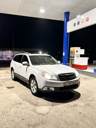 Subaru Outback, белый универсал (поколение BR, дорестайлинг). Полный привод AWD, клиренс повышенный. Кузов универсал с рейлингами на крыше и тонированными задними стеклами. Легкосплавные диски, противотуманные фары, омыватели фар, датчики света/освещения.