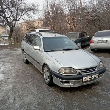 Toyota Avensis универсал (XW22, дорестайлинг), серебристый цвет, киргизские номера. Кузов и экстерьер: - Универсал с большой пятой дверью и средней/задней тонировкой. - Продольные рейлинги на крыш...