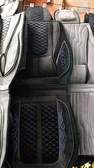 - Чехлы на сиденья универсального типа: анатомичные панели, комбинированные материалы (велюр/эко-кожа/ткань), стёганые вставки «ромб», декоративная вышивка (синие и красные элементы), боковая поддержка, проработанные швы под штатные подушки безопасности. Комплекты для передних и задних сидений, отдельные подголовники.