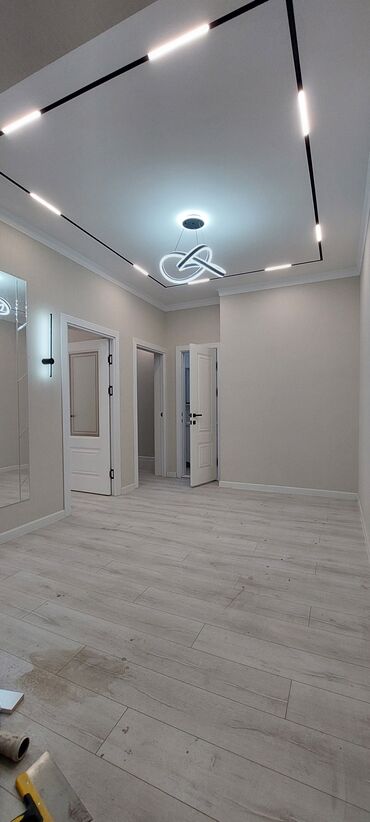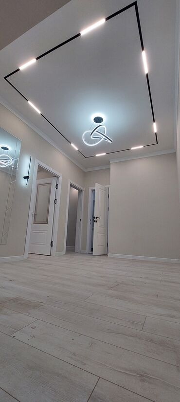 - Прихожая/коридор: дизайнерские потолки с черными треками и линейной подсветкой, центральный светильник, настенное зеркало, декоративный бра.