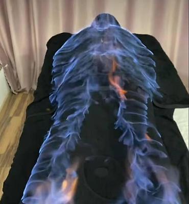- Огненный массаж (fire massage) по защищающему полотну с контролем пламени для глубокой проработки и прогрева мышц