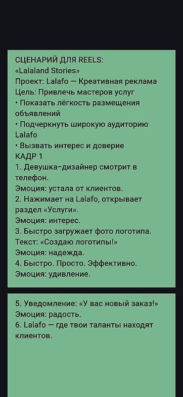 Связь: Пишите в личные сообщения Lalafo прямо сейчас! Обсудим ваш проект и подберем лучшее решение.