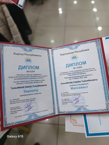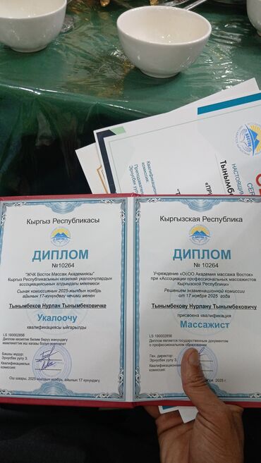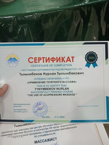 - Подтверждение квалификации: диплом «Массажист» и сертификат о прохождении курса «Применение точечного массажа» (The Use of Acupressure Massage).