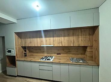 - Кухня: встроенный гарнитур во всю стену в сочетании матового серого и текстуры дерева; рабочая зона и фартук из того же материала; варочная поверхность на 4 конфорки, врезная мойка, место под вытяжку; встроенная ниша под технику и верхние антресоли до потолка.