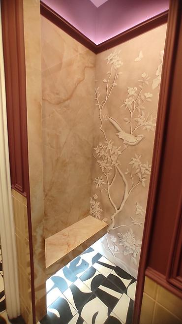 - Детали: вынос рисунка, раскрой без сколов, минимальные швы, запил под 45°, силикон в мокрых зонах, акуратная подсветка ниш и потолочных карнизов.