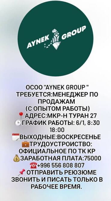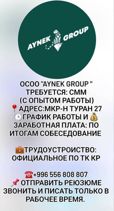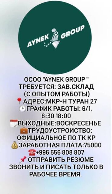 1-2 года опытаВ ОсОО "Aynek Group"открыты вакансии: Зав.склад, менеджер по продажам и СММ специалисты только с опытом работы.