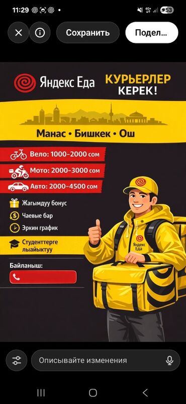Вакансия: курьер службы «Яндекс Еда» Локации: Манас, Бишкек, Ош. Форматы работы: - Велокурьер: доход 1000–2000 сом за смену - Мотокурьер: 2000–3000 сом - Автокурьер: 2000–4500 сом Что предлагает...