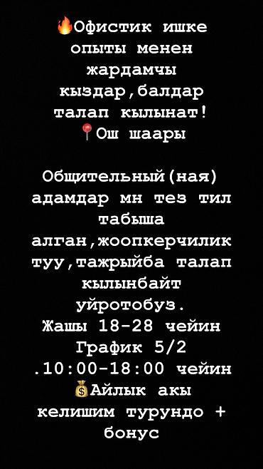 Вакансии (г. Ош) Ищем помощников. - Возраст: 18–30 лет - График: 5/2 - Время работы: 10:00–18:00 - Оплата: высокая + премии - Опыт не требуется (обучаем) - Уютный офис, дружный коллектив Для свя...