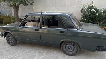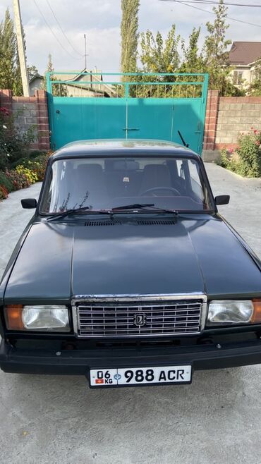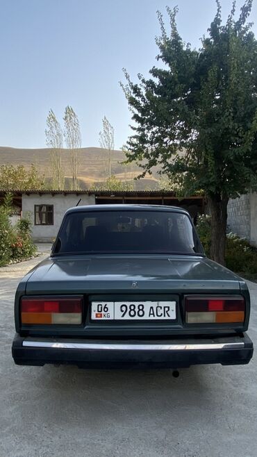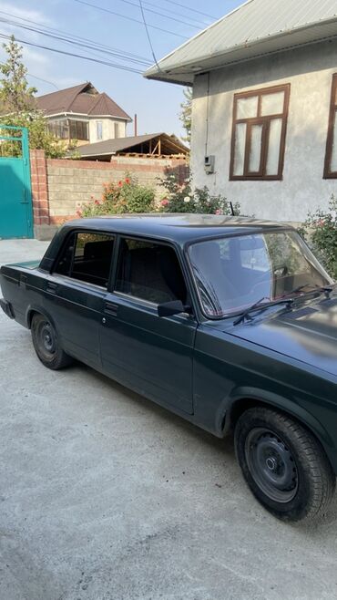 ВАЗ 2107, седан, темно‑зеленый цвет. Классический кузов “семерки” с хромированной решеткой радиатора, прямоугольными фарами и металлическими бамперами. 4 двери, 5 мест. Колеса на штампованных дисках, черные колесные колпаки. Антенна на крыше. Тонированные задние стекла. Черные наружные зеркала.