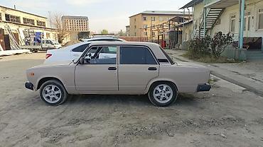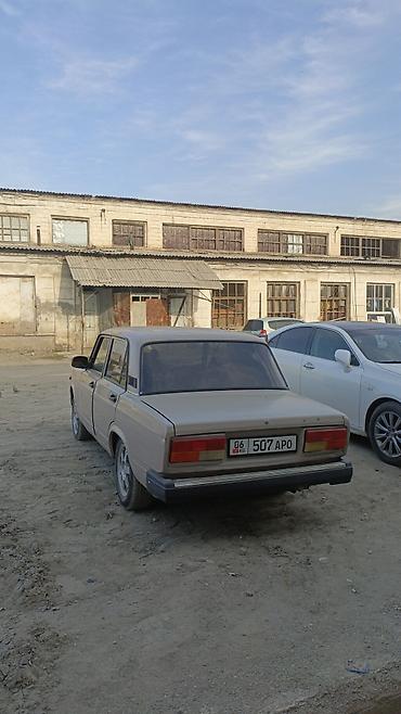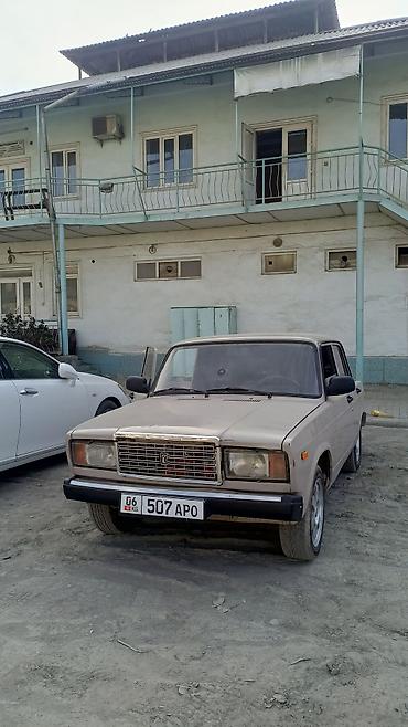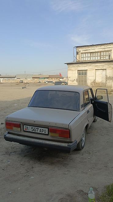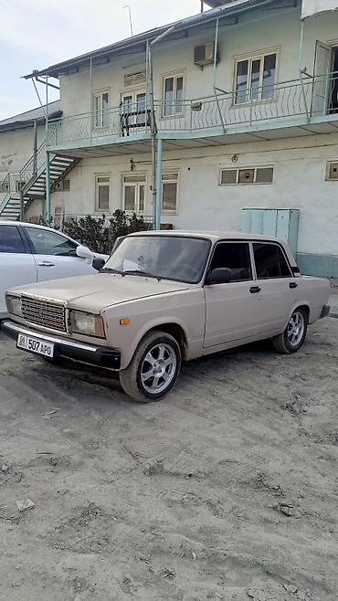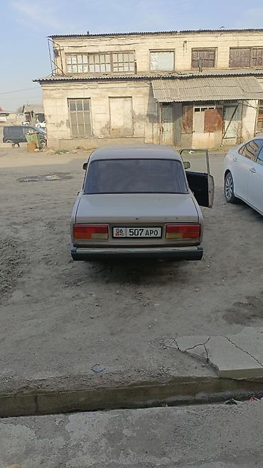 ВАЗ 2107, седан, бежевый цвет. Классический заднеприводный кузов, 4 двери. Колеса на легкосплавных дисках, тонировка задних стёкол. Бамперы и зеркала в чёрном цвете, хромированная решётка радиатора с эмблемой «Жигули». Кузовная геометрия ровная, зазоры дверей и капота равномерные. Оптика: прямоугольные фары спереди и блок-фонари сзади. Интерьер тёмный, стандартная панель приборов «классики». Номерные знаки KG.