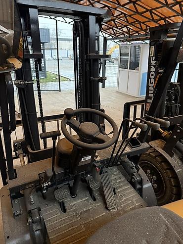 - Органы управления: рычаги подъёма/наклона мачты и бокового смещения, педали тормоз/газ, ручной стояночный тормоз