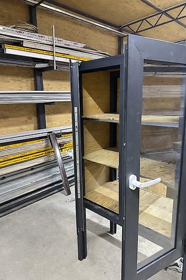 Предлагается витрина с прочным алюминиевым каркасом и прозрачными стеклянными дверцами, обеспечивающими хороший обзор содержимого. Внутри расположены полки из светлого дерева, создающие контраст с темным корпусом. Конструкция предусматривает ножки для устойчивости. Подходит для хранения и демонстрации различных предметов в магазине, офисе или дома.