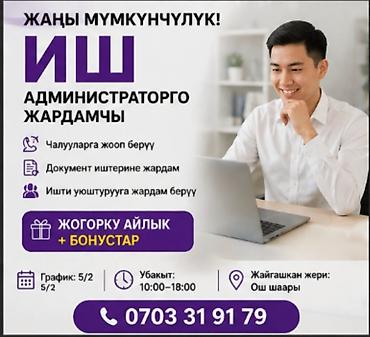 Вакансия: Помощник (требуется опыт администратора) Локация: город Ош График работы: 5/2, с 10:00 до 18:00 Возраст: 18–25 лет Ключевое требование: ответственность