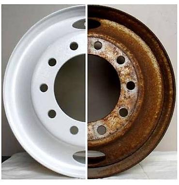 Стальные грузовые диски (разборные, под камерную/бескамерную резину). На фото показаны до и после пескоструйной обработки и окраски: верхний — исходный, нижний — после реставрации.