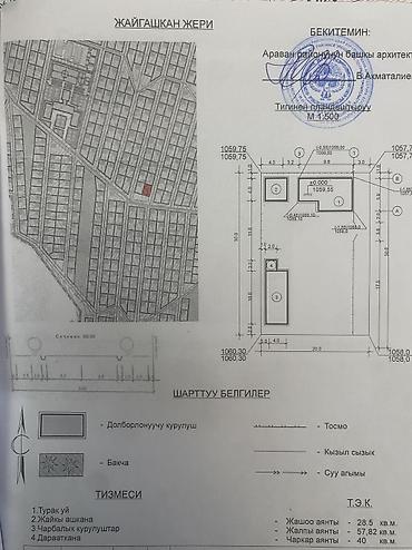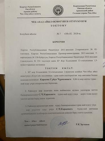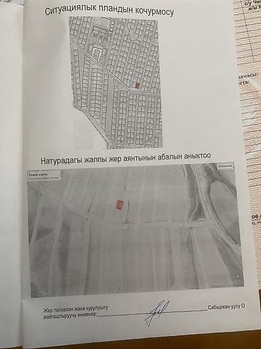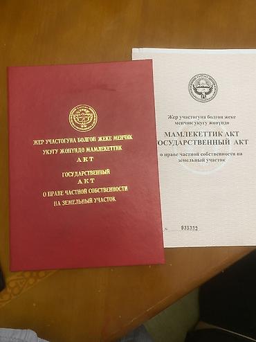 - Документы: Государственный акт о праве частной собственности на земельный участок (кыргызско-русский бланк), ситуационный план с привязкой, схема размещения строений с печатями и подписями, решение айыл өкмөту о предоставлении участка под ИЖС.