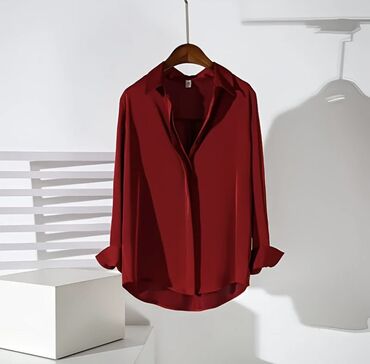 Женская рубашка свободного кроя, бордового/красного цвета. Характеристики: - Длина: удлинённая, округлённый низ спереди и сзади - Рукава: длинные с манжетами на пуговицах - Застёжка: планка на пуг...
